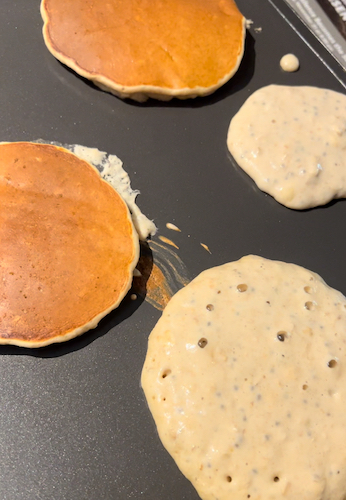Heat a nonstick pan or griddle on medium-high heat. Make your cakes! Low and slow works better for these since they are thick! Wait until the batter sets and starts to have air bubbles, then flip!